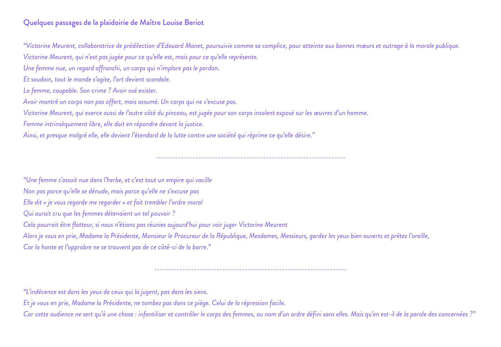Entre éclairages artistiques et plaidoiries passionnées, ce procès fictif a offert au public une lecture nouvelle du chef-d’œuvre de Manet et de son modèle, Victorine Meurent, artiste à part entière et symbole d’une liberté toujours d’actualité.