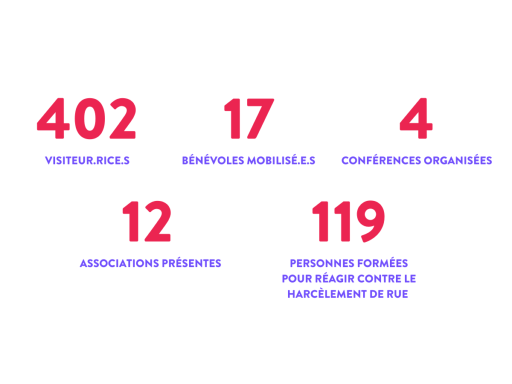 En plus du contenu proposé lors de l’exposition, le public a pu bénéficier de la formation Stand Up afin d’apprendre à réagir face au harcèlement de rue. La voiture Stand Up était animée par les formatrices de l’association En avant toute(s). A Lille, 119 personnes ont été formées à la méthode des 5 D.
